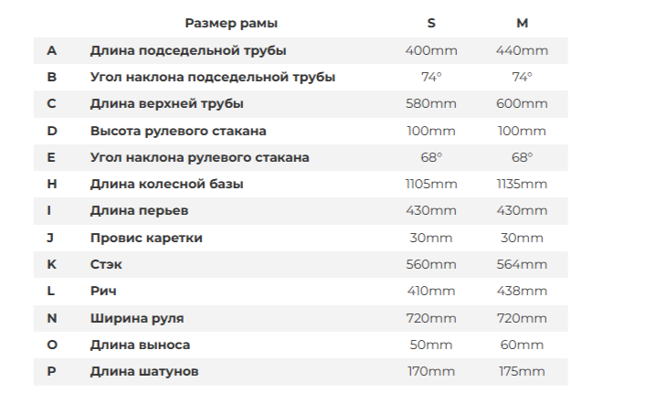 - Размеры рам: S подойдет на рост от 156 до 170 см, M от 168 до 178 см